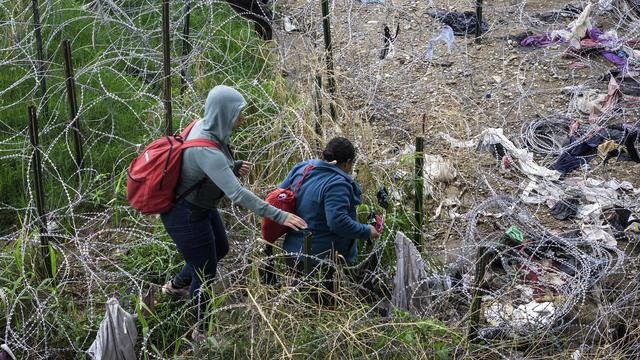当地时间2024年3月17日,美国得州伊格尔帕斯,移民们从墨西哥穿过格兰德河,穿过铁丝网。作为州长格雷格·阿博特“孤星行动”的一部分,得州国民警卫队在鹰口设置了大量的铁丝网,以阻止移民越境进入得州。
